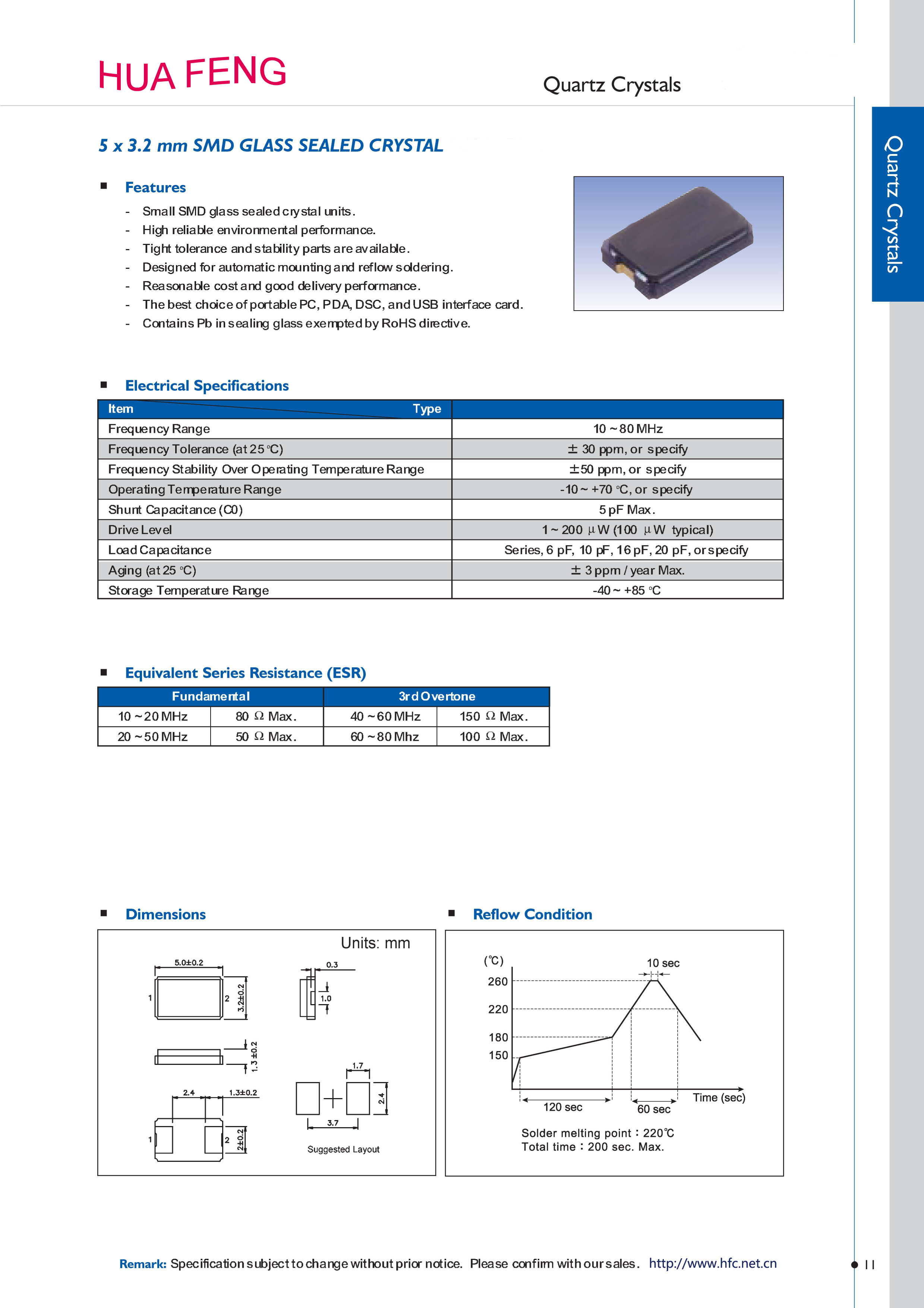 石英晶體諧振器  5032 Glass 2pad   Small SMD glass sealed crystal units   5.0*3.2*1.3  10.000MHZ~80.000MHZ yes